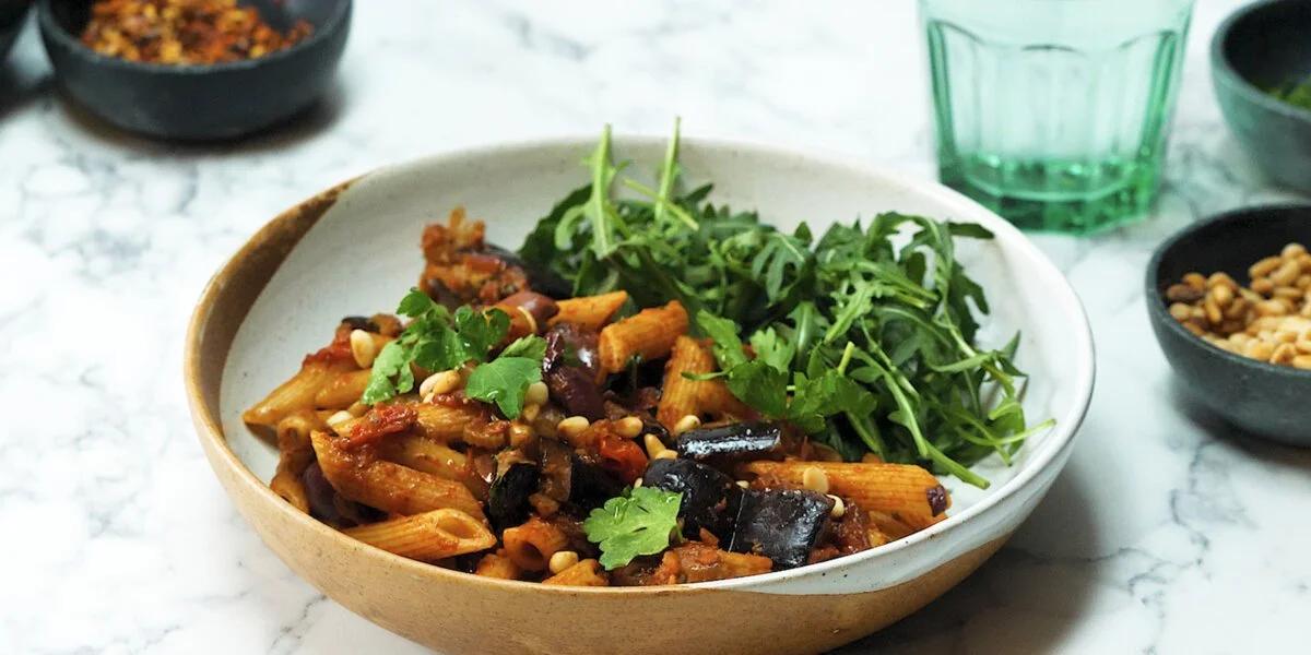 Whip up this easy vegetarian caponata pasta in just 20 minutes! It's simple to make, budget-friendly, packs three of your five-a-day into one delicious meal and will serve a family of four!